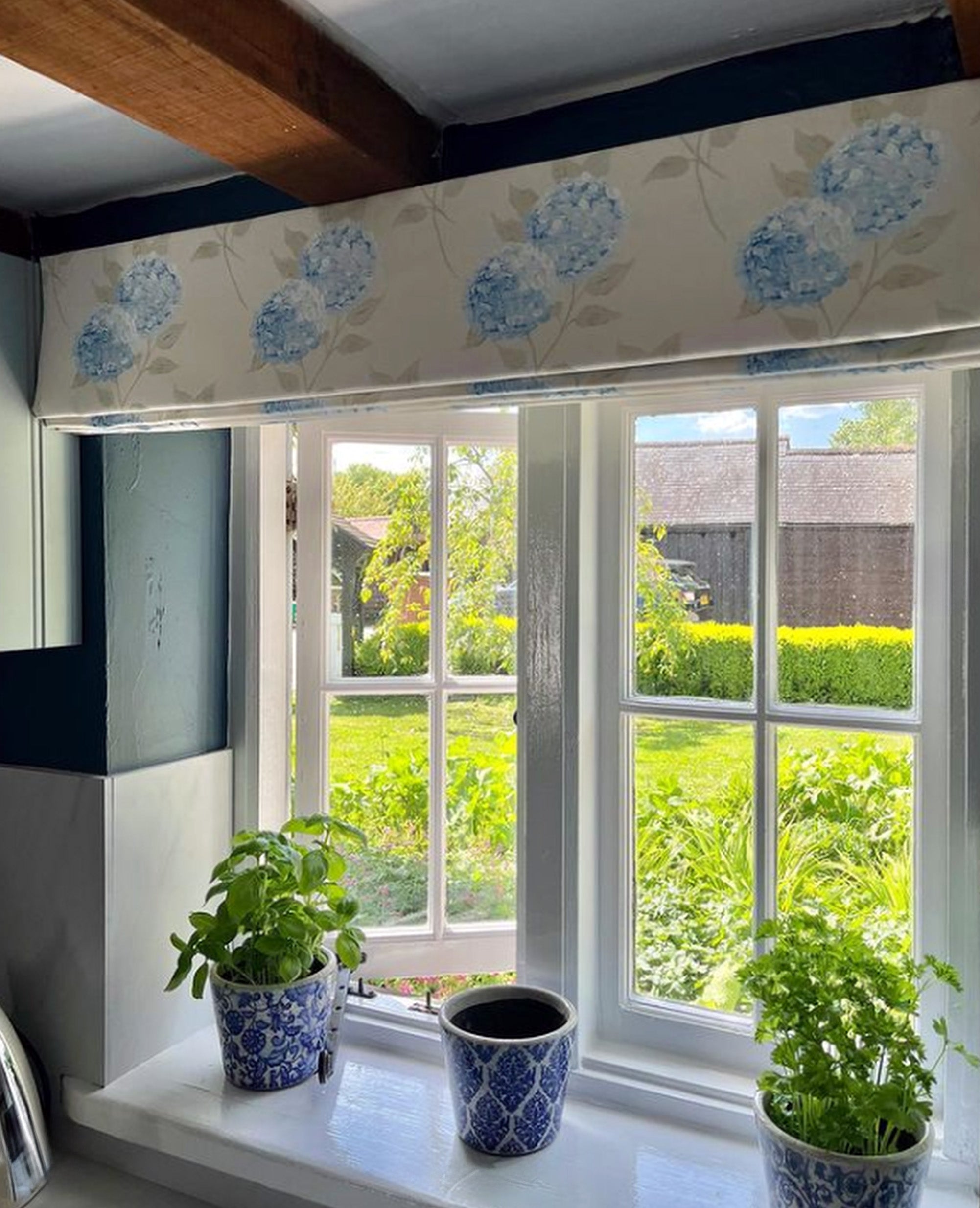 Our stunning vintage style Hydrangea linen fabric in the softest blues on a mist linen background. Simply beautiful as full length billowing floral curtains or blinds and cushions. The design has been printed in the UK from one of Maggie's hand painted designs. Our Dorset Stripe fabric in soft shutter green on mist co ordinates perfectly. Perfect for any vintage style floral fabric lover.