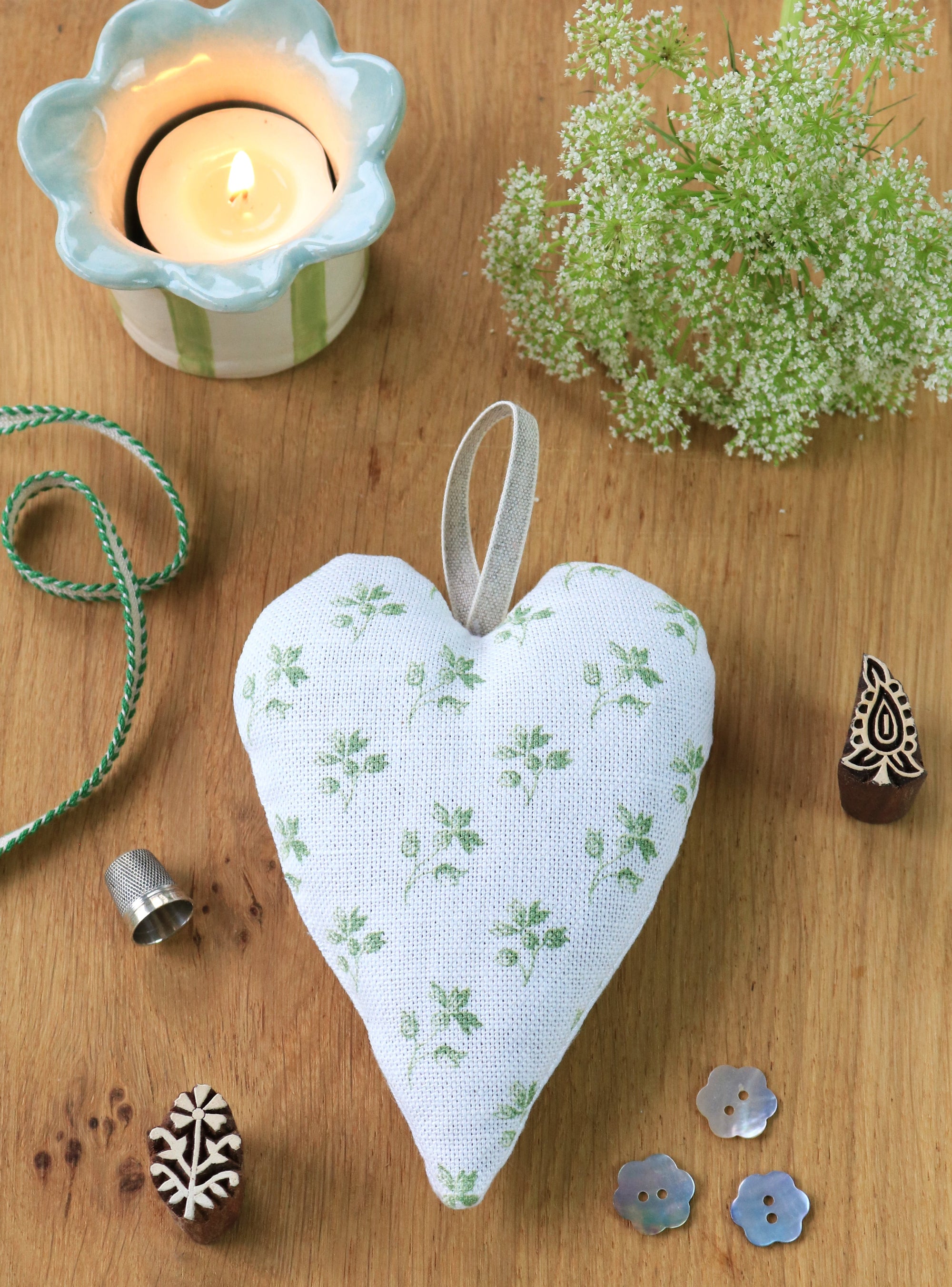This exquisite little organic lavender sachet has been beautifully hand sewn, filled  and block printed for us in Wiltshire. Each sachet is entirely unique and makes a wonderful gift. The vintage linen heart has been hand block printed with a stunning cow parsley and dragonfly design with embroidered detailing, complete with a little mother of pearl button and silver detailing on the dragonfly’s wings. The reverse is finished in our Ava fabric in orchard green. Presented in a stylish navy gift box too.
