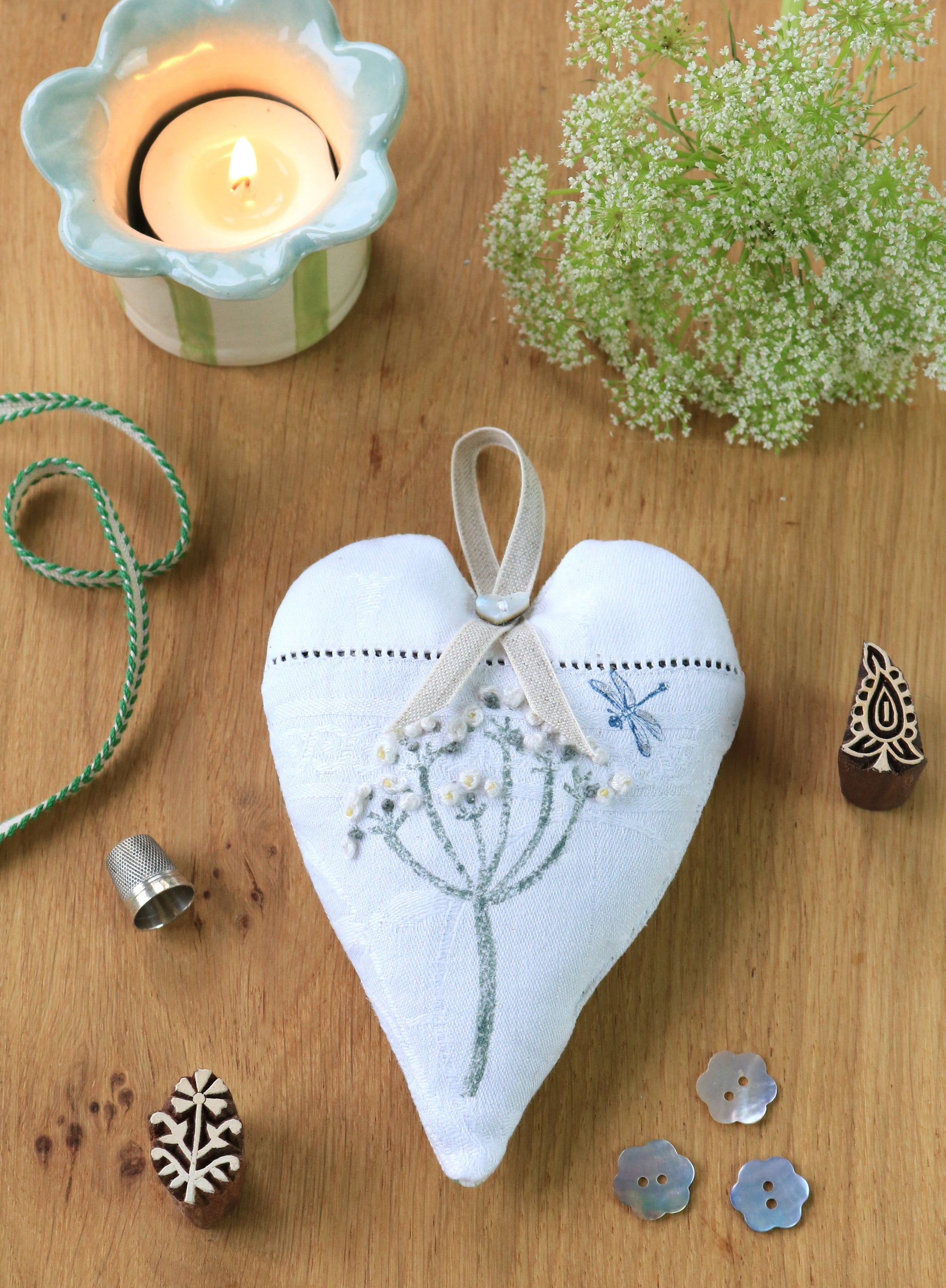 Hand Made Lavender Heart - Block Printed Cow Parsley & Dragonfly