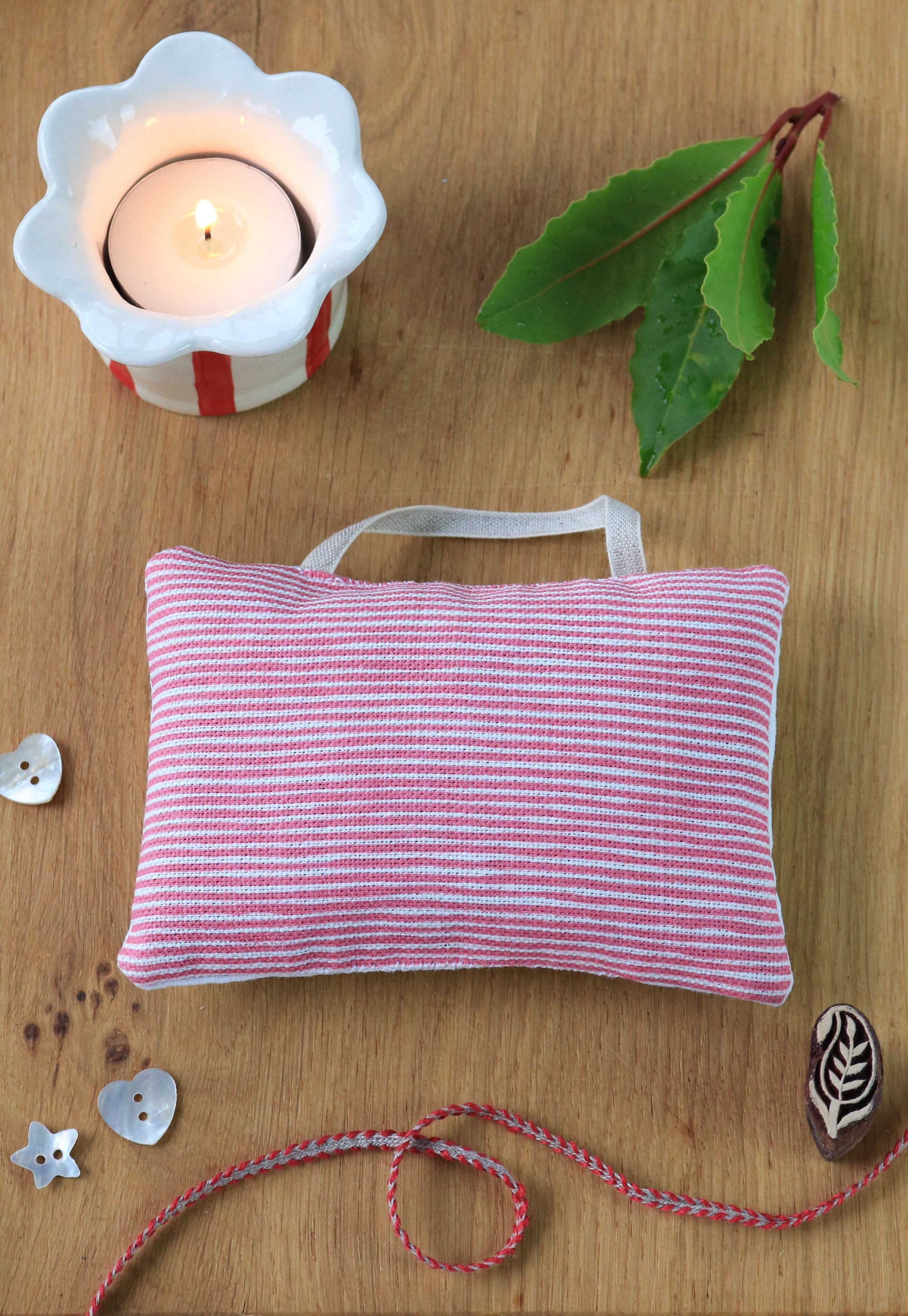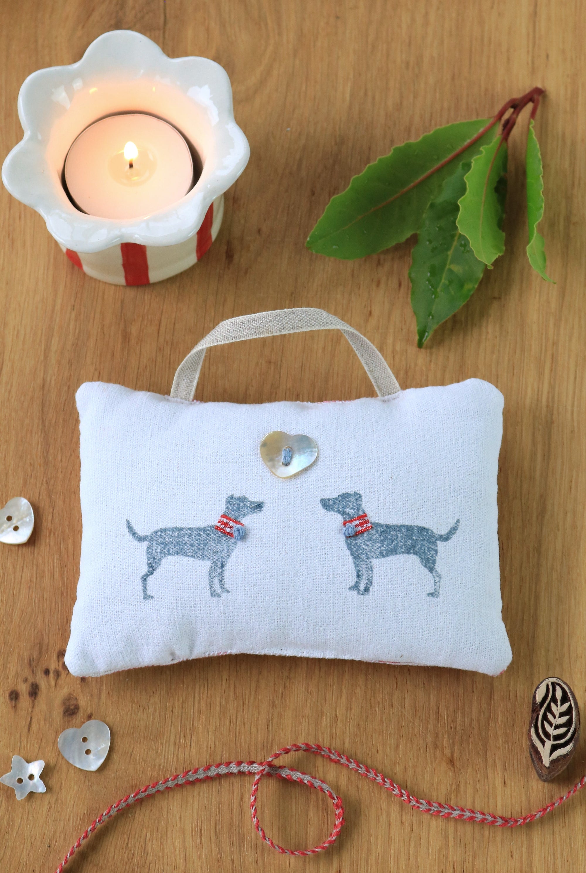 This exquisite little organic lavender sachet has been beautifully hand sewn and block printed for us in Wiltshire. Each sachet is entirely unique and makes a wonderful gift. The vintage linen sachet has been beautifully hand block printed with a pair of little Jack Russell terriers complete with fabric and embroidered collars. The reverse is finished in our Pinstripe fabric in raspberry. Presented in a stylish navy gift box.
