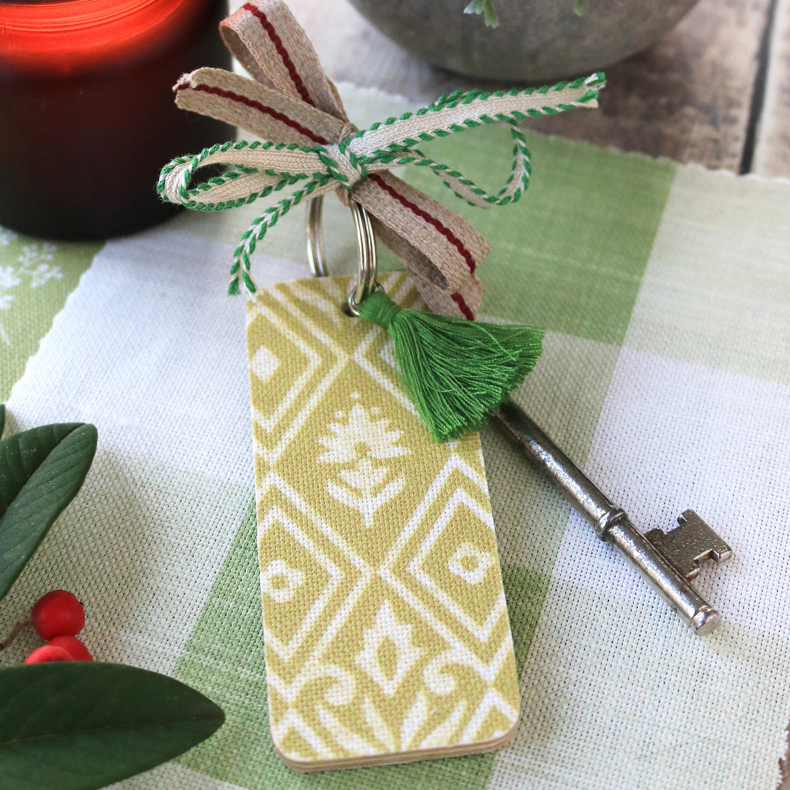 Handcrafted in our Dorset studio, these elegant fabric-covered wooden keyrings are thoughtfully created from fabric remnants that might otherwise be discarded. Each keyring is expertly sealed for lasting durability and adorned with a refined double bow in coordinating ribbons, complemented by a vibrant tassel. These distinctive keyrings serve as charming and affordable gifts with a touch of sophistication.