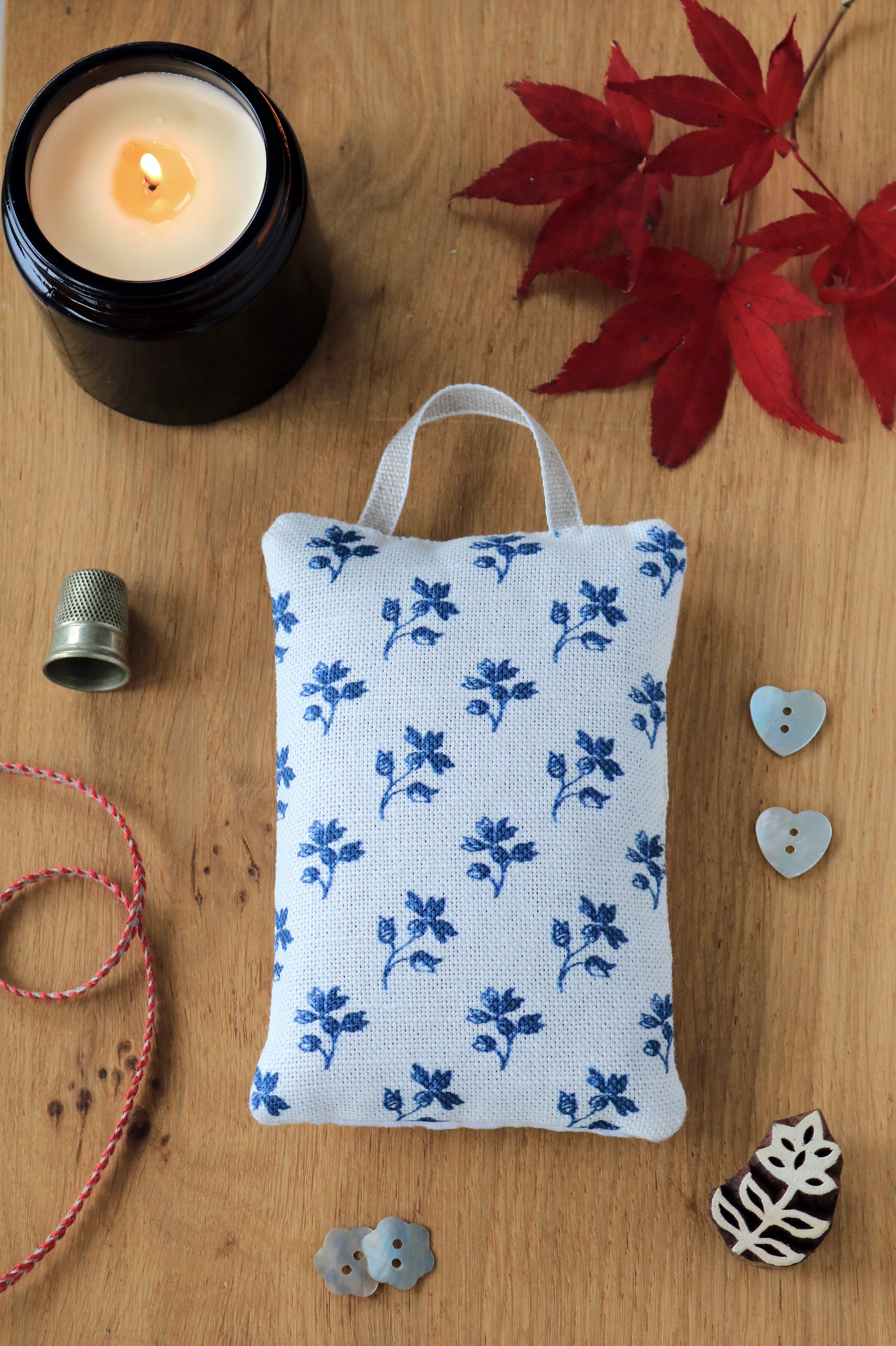 This exquisite little organic lavender sachet has been entirely hand sewn and block printed for us in Wiltshire. Each sachet is entirely unique and makes a perfect gift. The vintage linen front has been block printed with a beautiful navy hare complete with little embroidered flower. The reverse is finished in our Ava fabric in Bute blue. Presented in a smart navy gift box too.