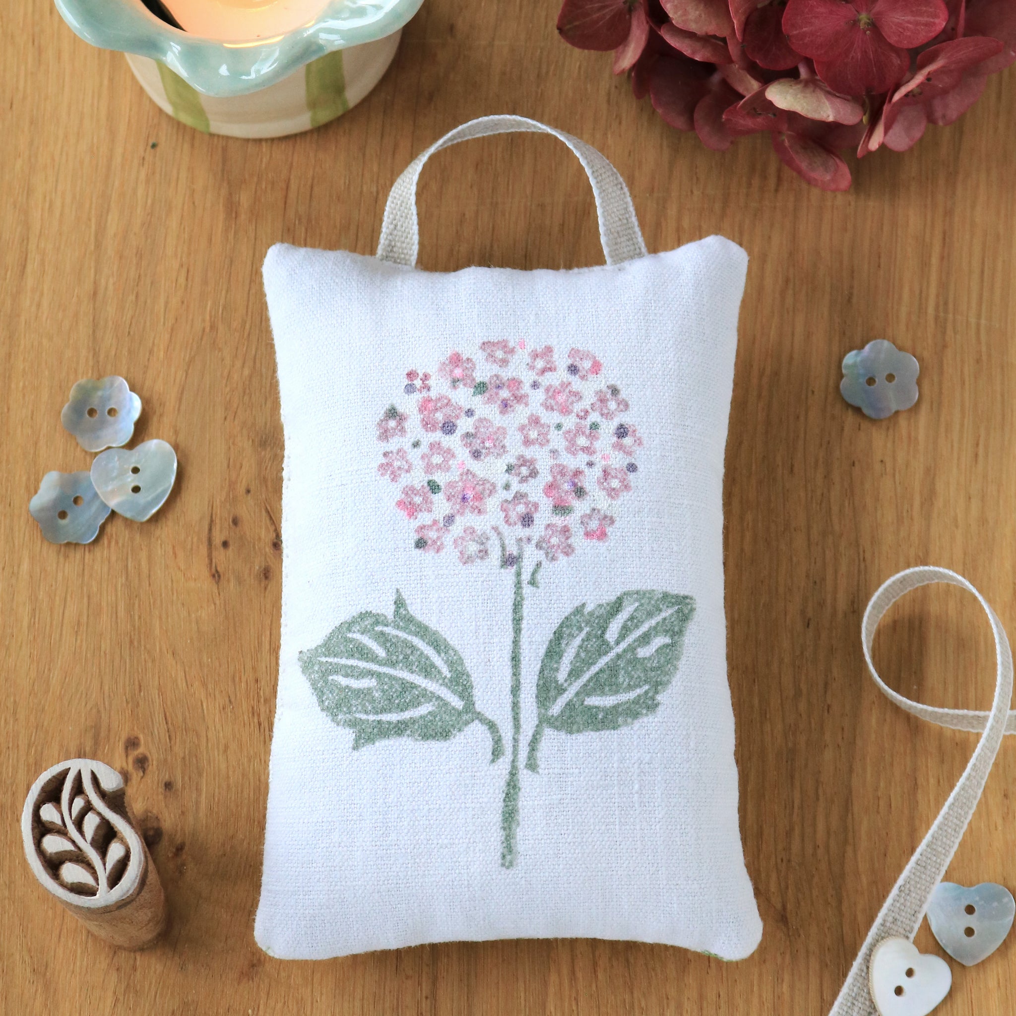 This exquisite little organic lavender sachet has been entirely hand sewn and block printed for us in Wiltshire. Each sachet is entirely unique and makes a perfect gift. The vintage linen front has been printed with a beautiful hydrangea complete with hand painted detailing. The reverse is finished in our Ava fabric in orchard green. Presented in a stylish navy gift box too.