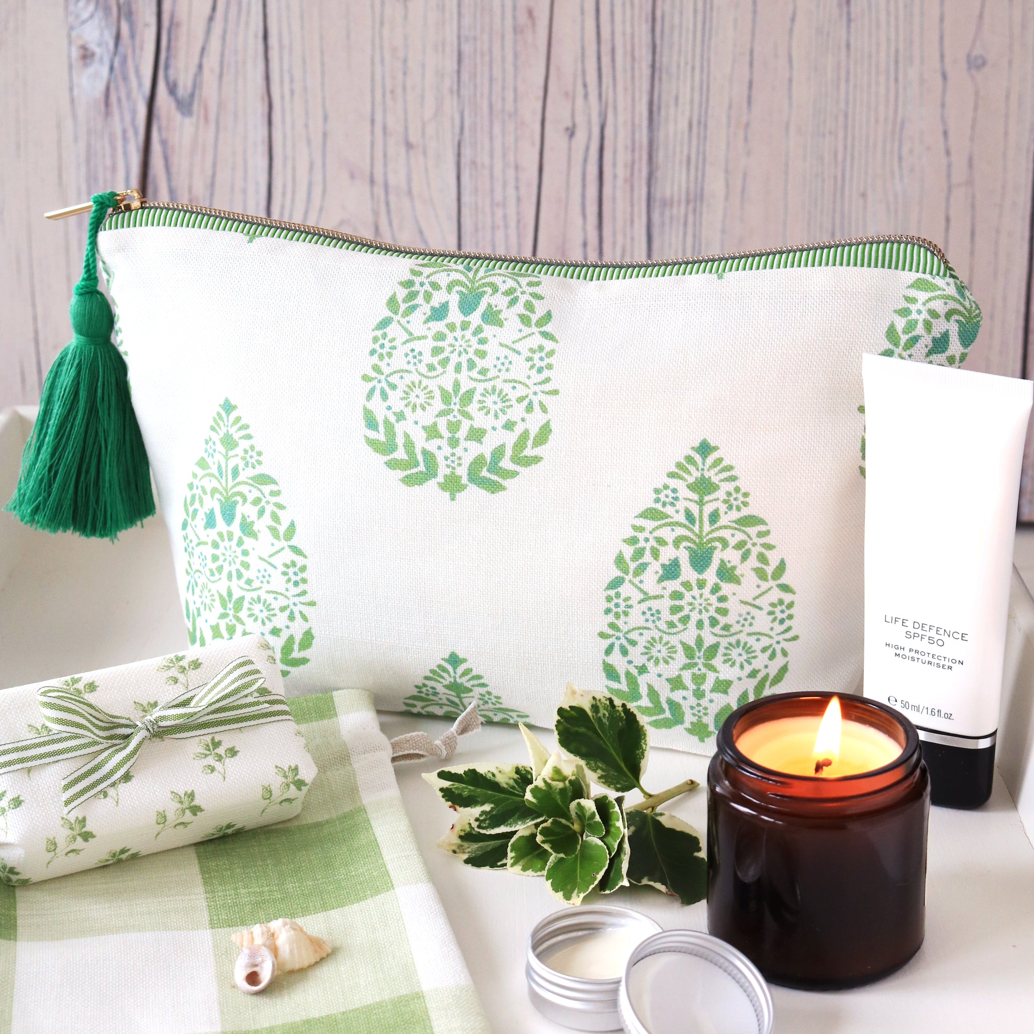 New for this season is this super wash bag featuring Adriana’s Garden in mill green and jay complete with a pretty green tassel along with a very stylish striped zip. This Indian inspired design was hand painted here in our studio and is part of our Lambrook Geranium collection.