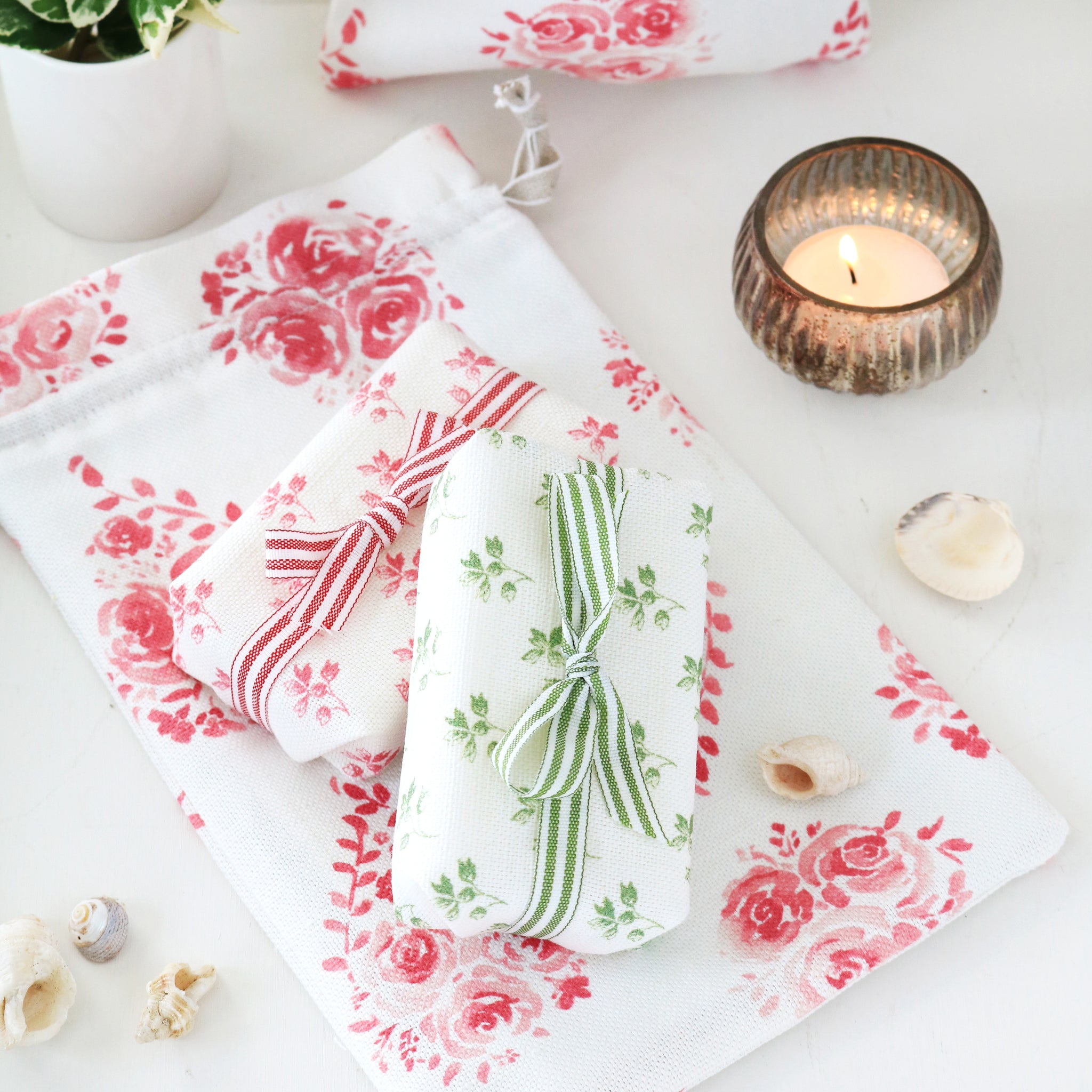 • Fabric wrapped French soaps in Ava Raspberry and Orchard Green