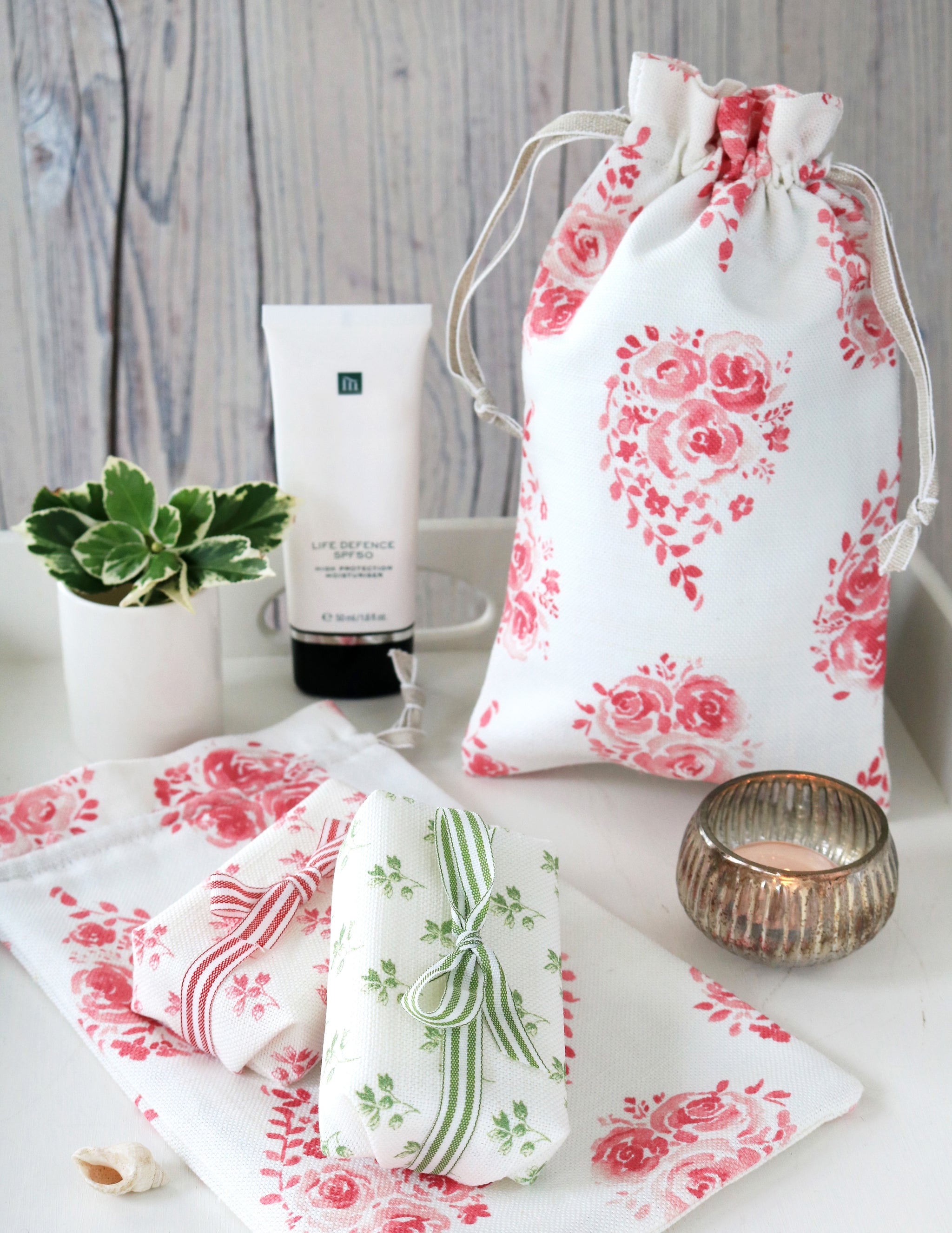 This pretty little waterproof lined toiletry bag is perfect for soap or a flannel when you are away. This one comes with 2 gorgeous co ordinating fabric covered soaps too! The soap / flannel bag shown here is in our popular Rose Drop design, faded raspberry on white.