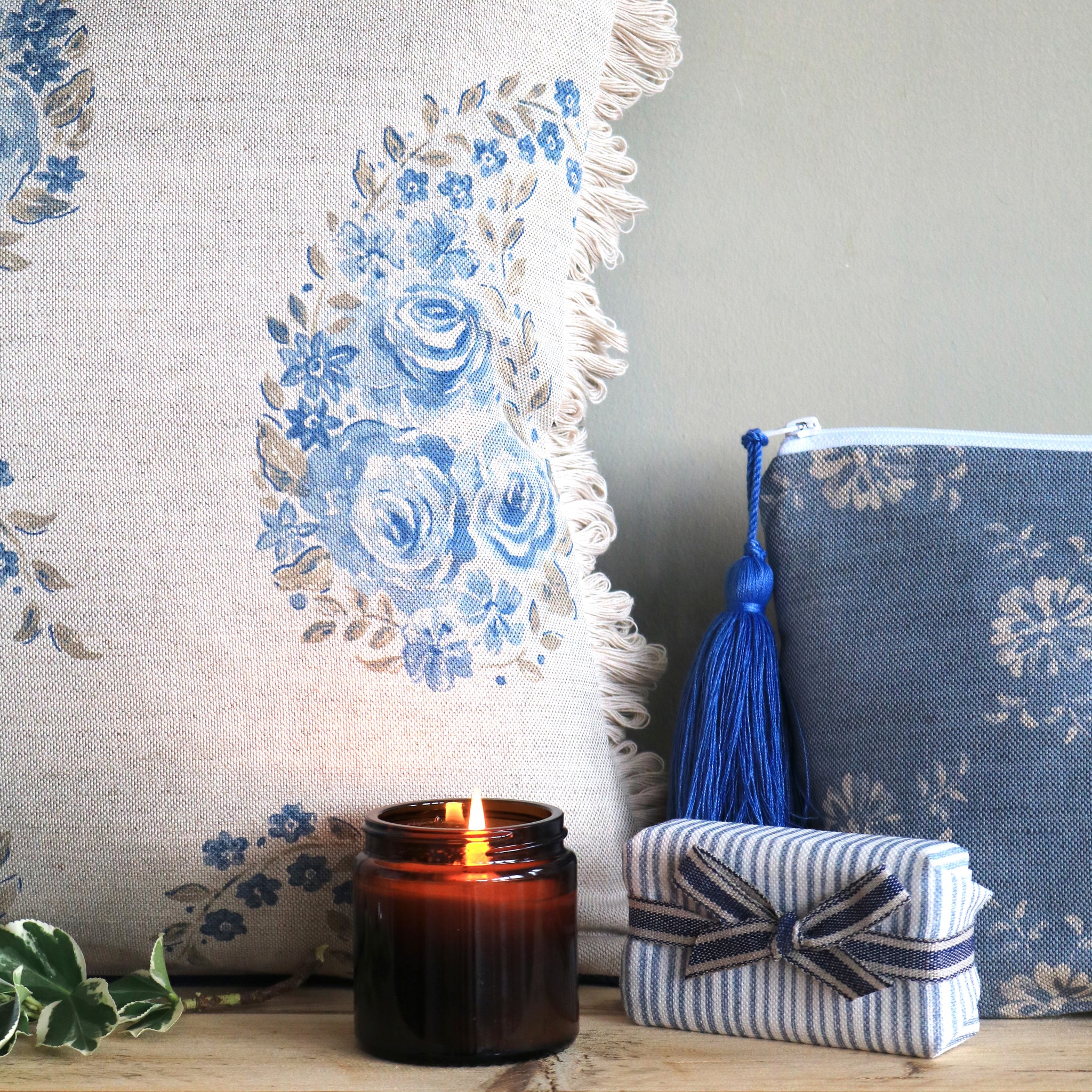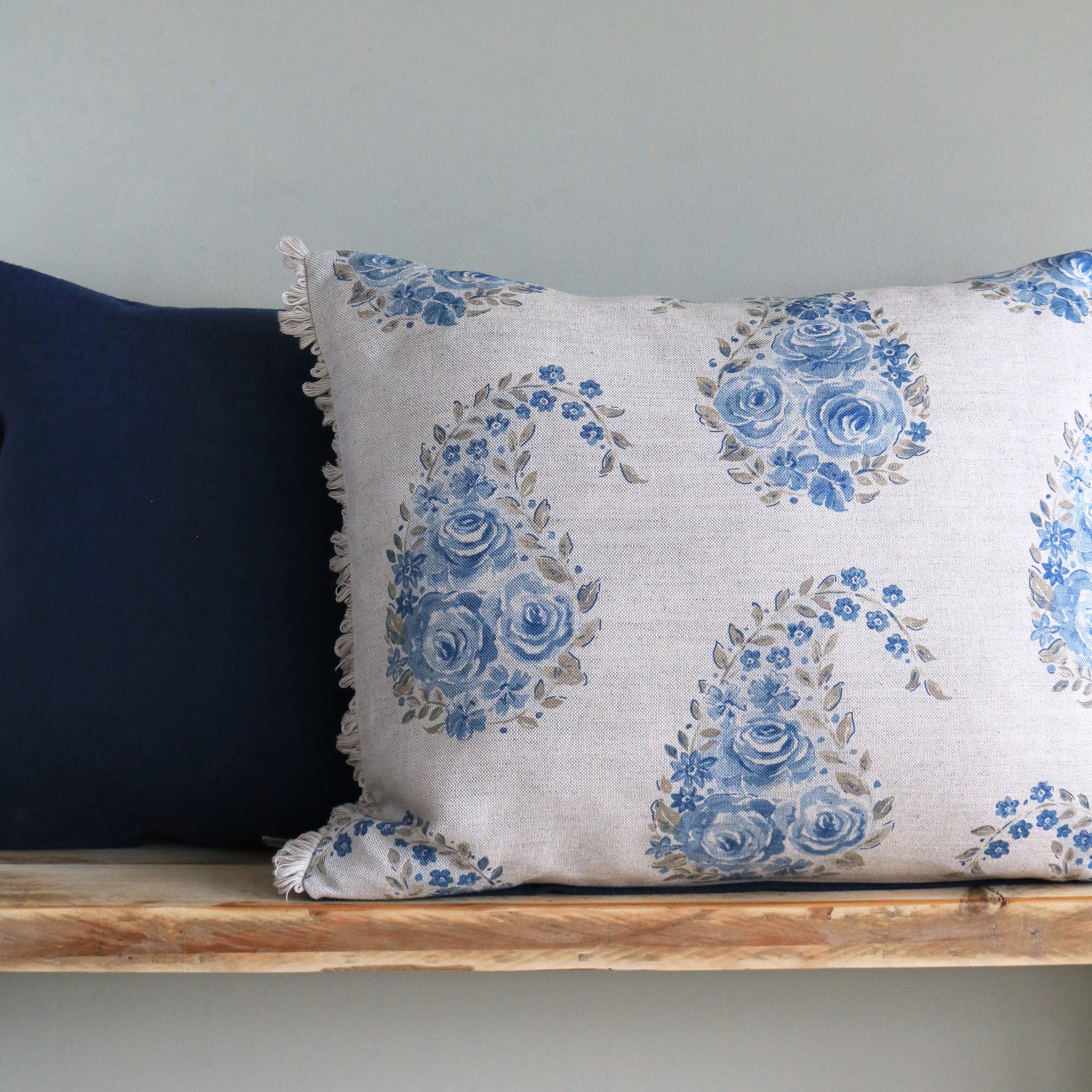 Stunning ready made feature cushions in Paisley Rose - vintage country blue. Expertly made here in Dorset by Alli, these cushions have been finished with pretty stone fan trim to add texture and each is supplied with a superior feather inner. The reverse is in a beautifully soft co ordinating plain navy Linara fabric. Super smart to add to your home this season or buy as a gift for someone special.