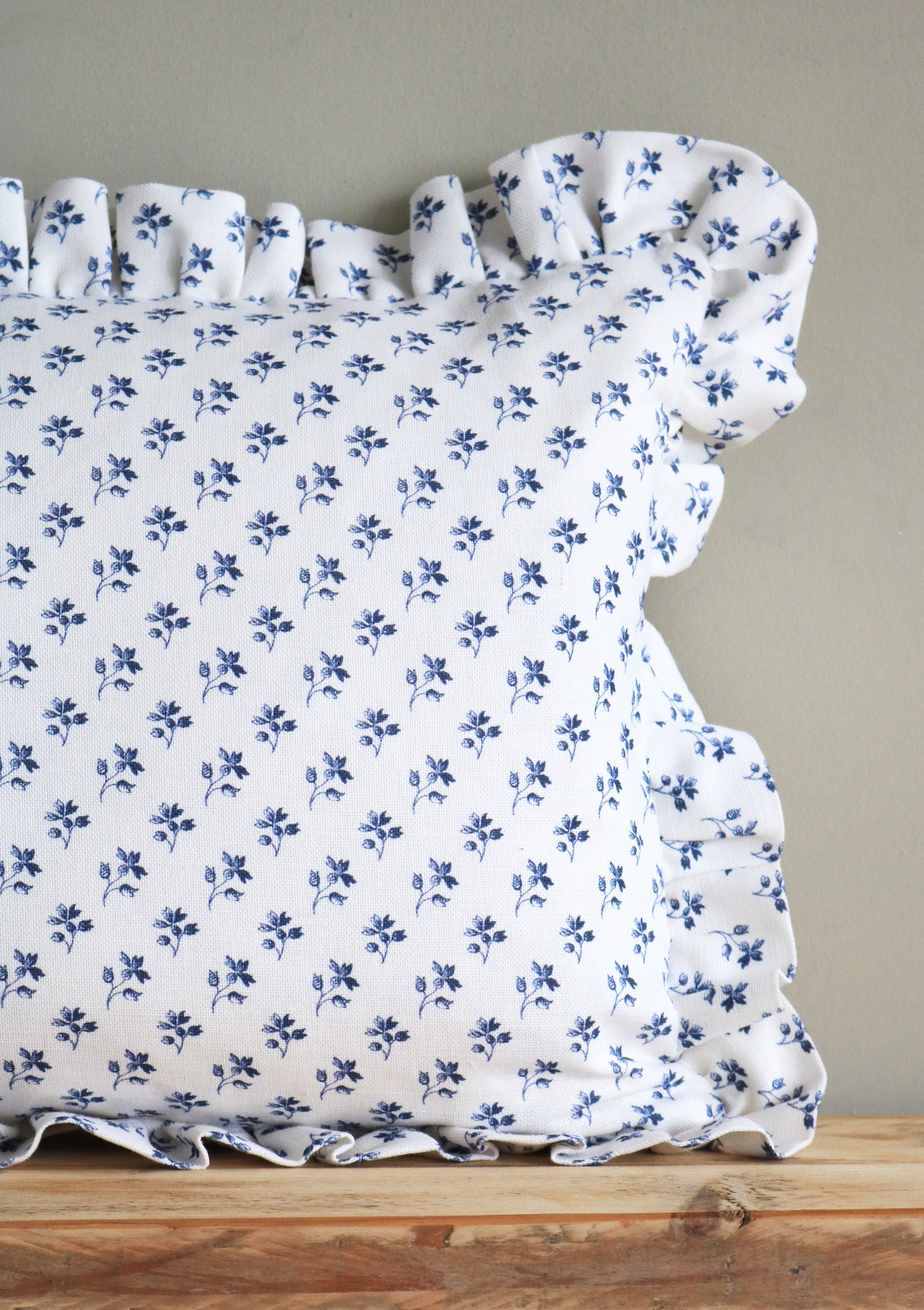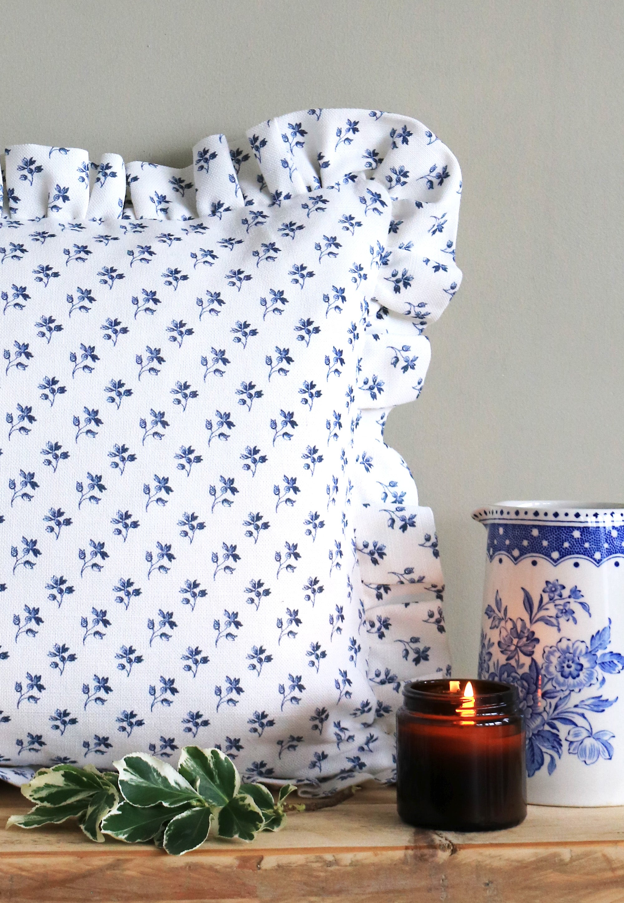 We love these new frilled cushions so much! Perfect on a sofa, occasional chair or bed these very pretty rectangular cushions feature Ava in Bute blue on both sides. Exquisitely handmade for us here in Dorset by Alli, each cushion comes with a luxury feather inner. Further colourways to follow.