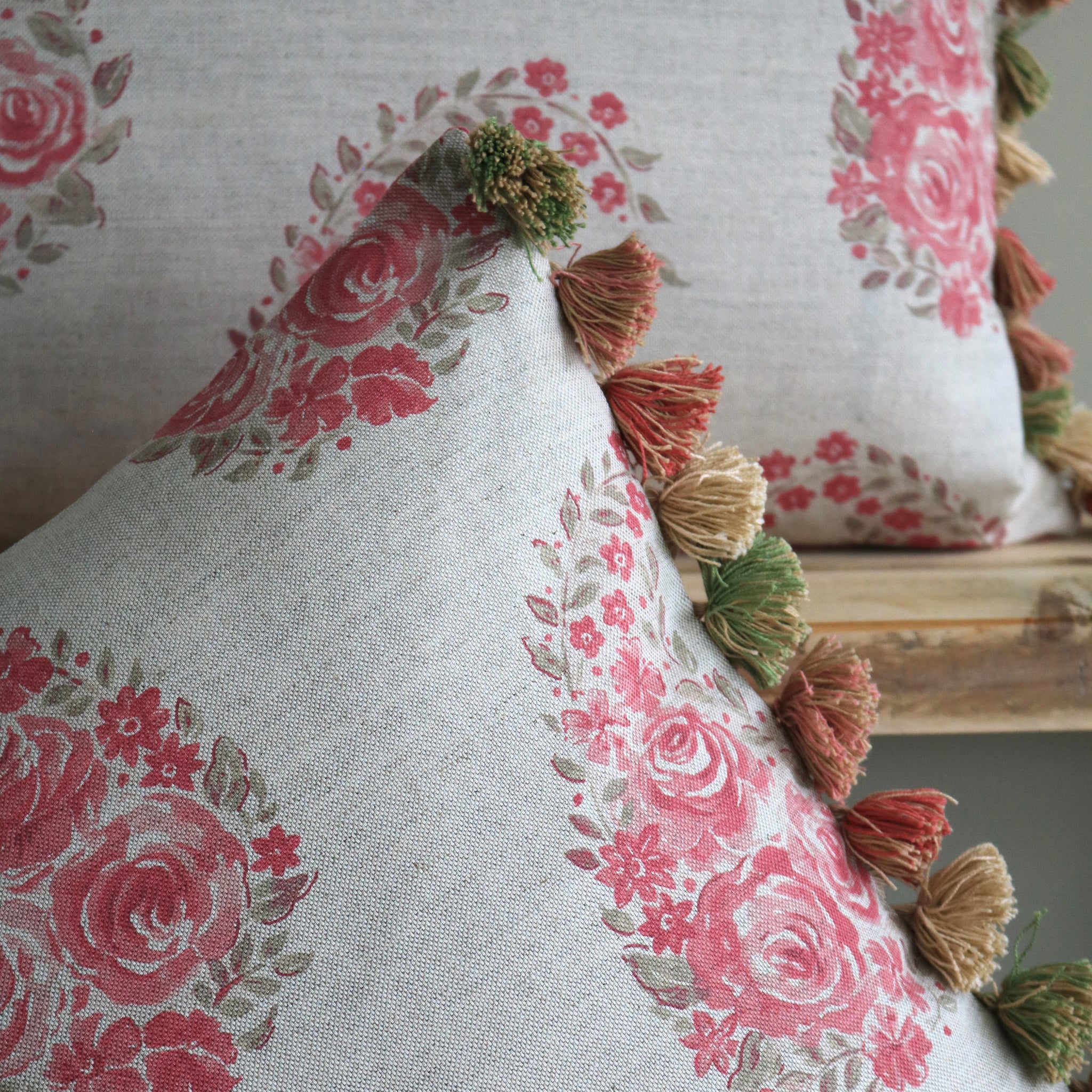 Stunning ready made feature cushions in Paisley Rose - faded raspberry. Expertly made here in Dorset by Alli, these cushions have been finished with a beautiful tassel trim to add texture and extra colour. Each is supplied with a luxury super fill feather inner. The reverse is in a beautifully soft co ordinating plain Linara Rubus fabric. Super smart to add to your home this season or buy as a gift for someone special.