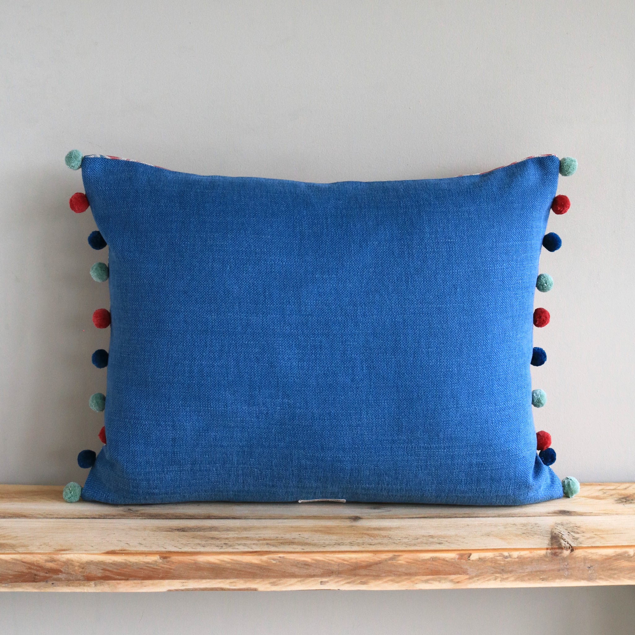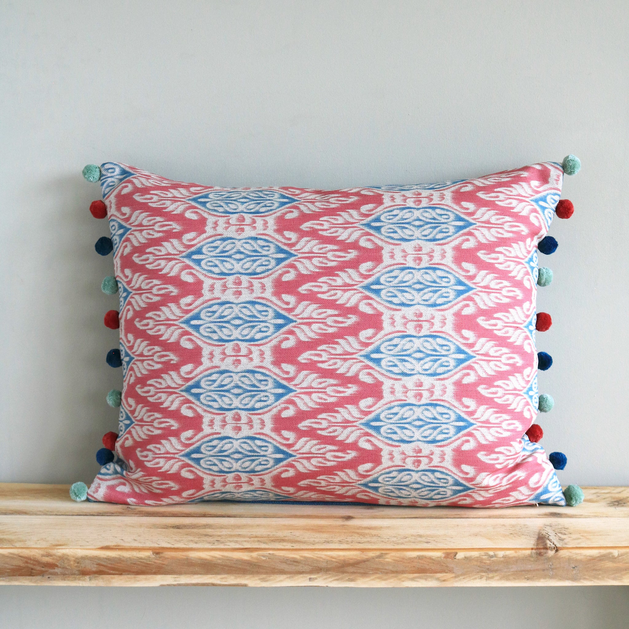 These stunning ready made rectangular cushions in our popular Zamira design will add luxury and bold colour to your home this season. Zamira, designed by Vicky, is a striking ikat design which makes up into stunning cushions as shown here in faded raspberry and soft teal. The pretty coloured pom pom trim adds further colour, texture and fun and the plain teal reverse contrasts beautifully too.