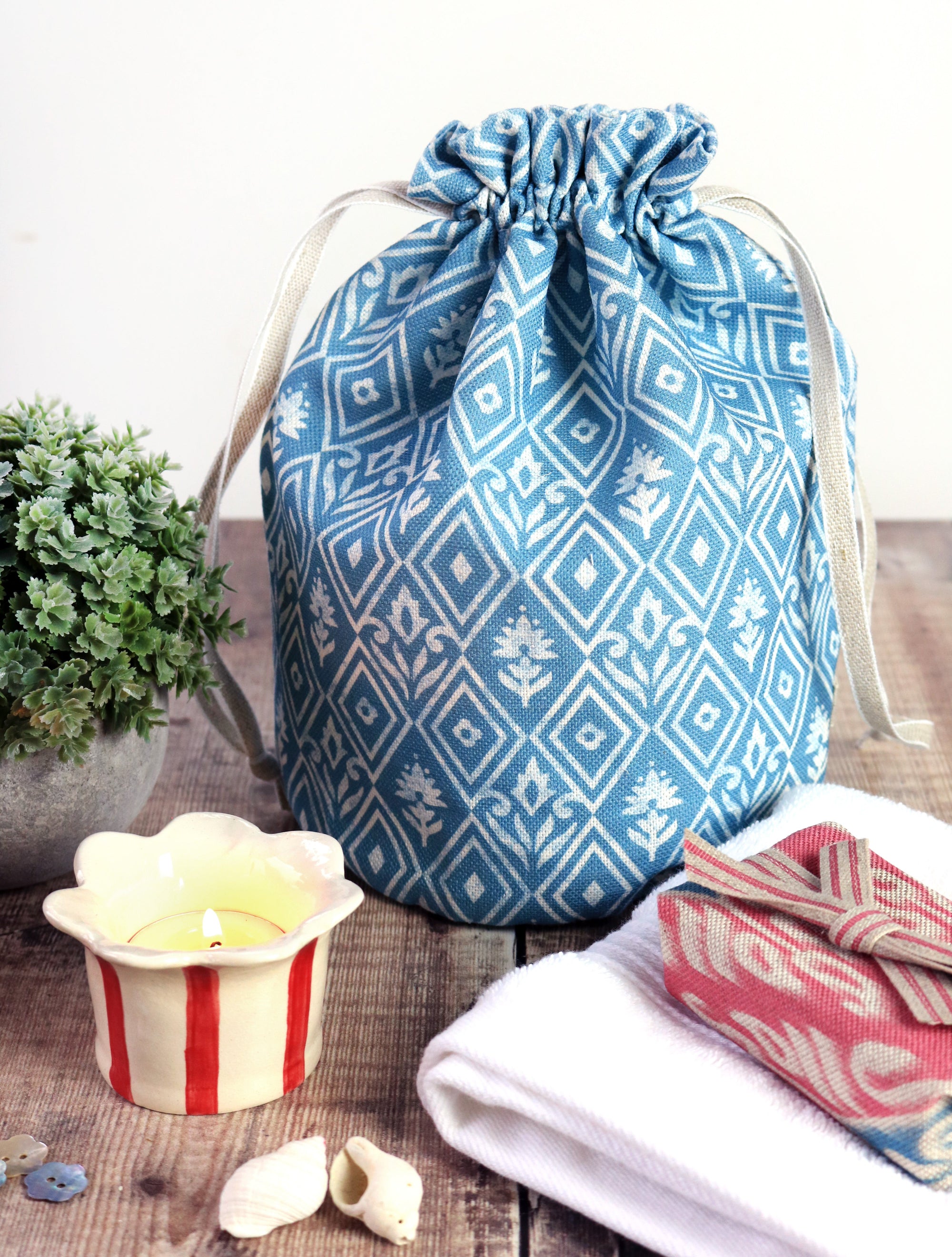 This stunning vintage style draw string toiletry bag has a practical white waterproof lining and is roomy enough for plenty of make up and toiletries. A lovely gift and why not add a co ordinating fabric wrapped soap too for an extra special gift.