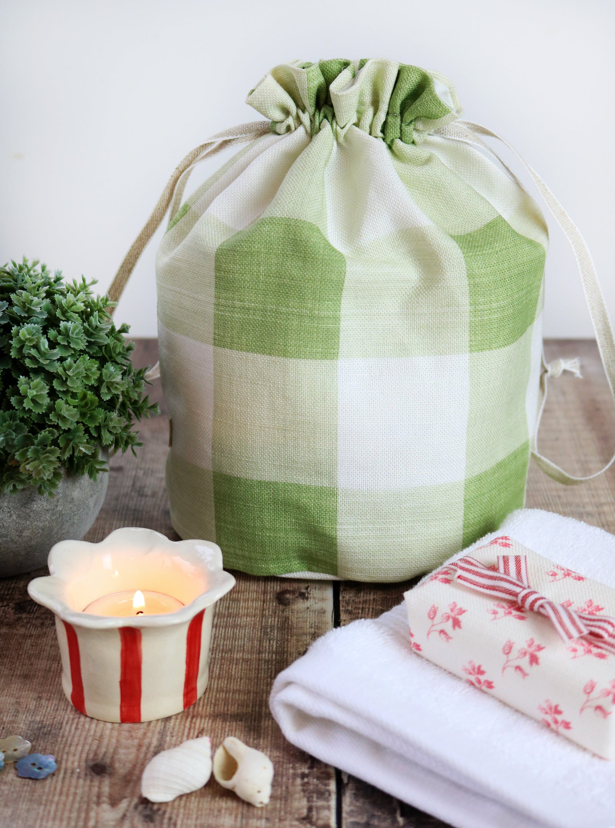 This stunning vintage style draw string toiletry bag has a practical white waterproof lining and is roomy enough for plenty of make up and toiletries. Why not add a co ordinating fabric covered French soap too for an extra special gift.