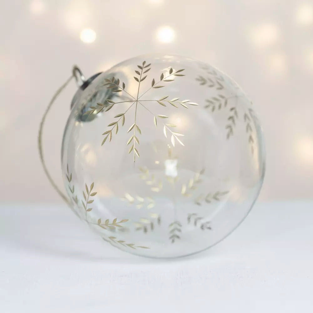 This striking 15cm clear glass bauble showcases a beautifully hand-etched golden snowflake design. Its delicate detailing captures the eye. Perfect to add a touch of exquisite craftsmanship and style to your tree.