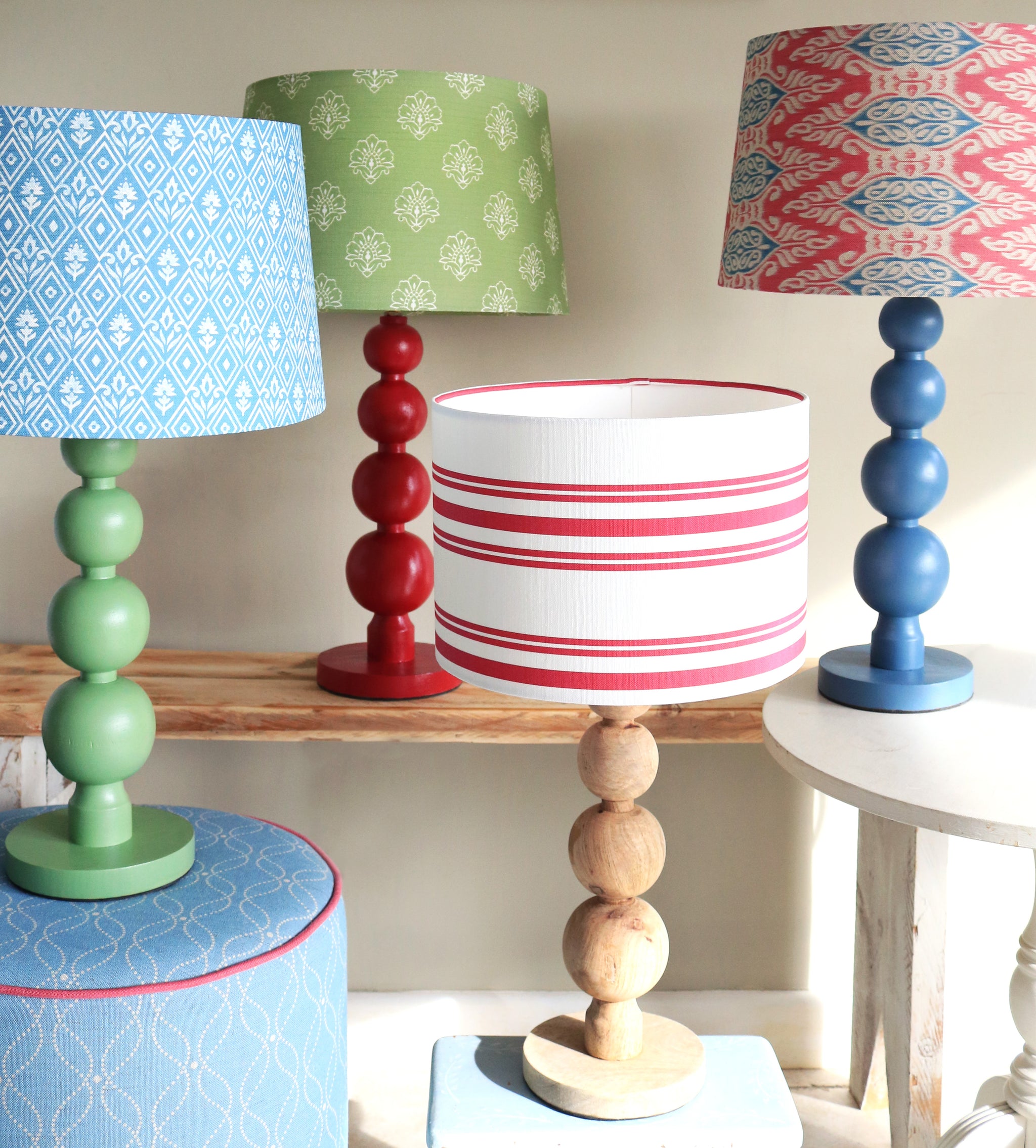 These stunning hand painted wooden lamp bases will add a contemporary pop of colour to your home. Team with one of our hand made shades for the perfect colour accent for your room. Shown here with Zamira French drum shade.